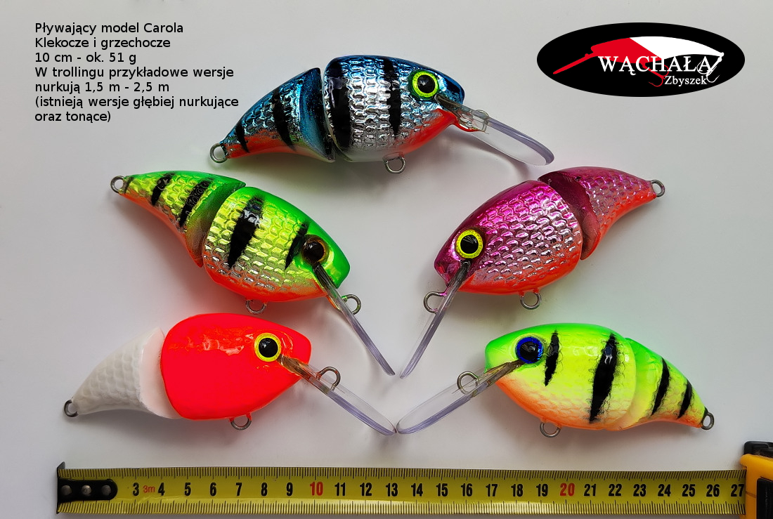 Wobler klekoczący, który stworzyłem na początku lat dziewięćdziesiątych, jest nietuzinkowym narzędziem do połowu ryb, takich jak sum i szczupak. Ten model, pod nazwą Carola, został zaprojektowany specjalnie do płytkiego trollingu, z możliwością przeciętnego nurkowania na głębokość od 1 do 2,5 metra. Jest wielce prawdopodobne poprowadzenie woblera blisko powierzchni, umiejętnie zwalniając tempo prowadzenia, tym zachowując jeszcze atrakcyjną pracę (klekotanie i grzechotanie).